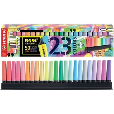 סט טוש זוהר BOSS – 23 יחידות עם מעמד שולחני מהודר סט טושים זוהרים איכותיים מבית BOSS בצבעים חדים וברורים לכל שימוש במשרד או בלימודים. מגיע עם מעמד שולחני יציב ונוח שמאפשר גישה מהירה לכל צבע. הטושים בעלי דיו זוהר עשיר, עמיד לאורך זמן ולא מכתים את הדף. מתאים לסימון מסמכים, הדגשה בלוחות ולשימוש יומיומי אינטנסיבי. פתרון מושלם לארגון שולחן העבודה ולהבלטת כל מה שחשוב באמת.